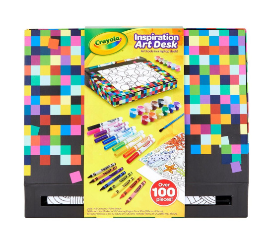 The Inspiration Art Desk by Crayola® provides a huge assortment of art supplies in a portable storage case that also functions as an art desk! From markers and crayons to paints and a brush, you get a variety of ways to draw, doodle and create colorful masterpieces. Pick your art tools, close the case and use the angled desktop to create art—it's your own portable art studio. Includes 30 broad line markers, 48 crayons, 18 paint pots, 1 paintbrush, 20 line art sheets, 20 blank sheets and art desk with storage. For 4 years and up.