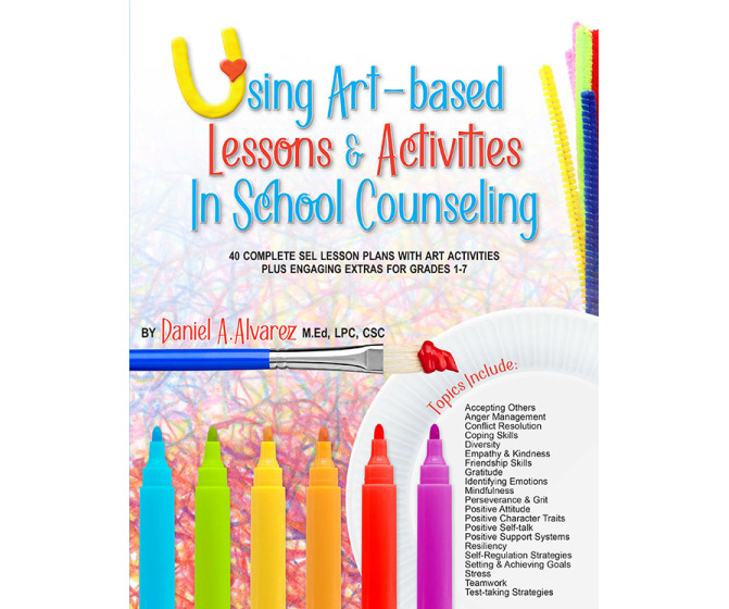 Using Art-based Lessons & Activities In School Counseling: 40 Complete SEL Lesson Plans with Art Activities Plus Engaging Extras for Grades 1-7 offers creative, art-based activities that will help students to express their emotions; build self-esteem and self-awareness; deal with stress-related and anger-related issues; and develop a positive attitude, resiliency, perseverance, and grit. And, for many students, just doing art activities and creating crafts with their hands is fun and engaging and improves their attention span.