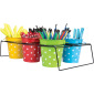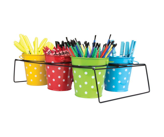 Organize small items and keep all your supplies in one place with this bucket caddy. Caddy comes with our six 4" polka dots buckets: aqua, lime, yellow, purple, red, and black . The buckets are great for holding scissors, pens, pencils, markers, glue sticks, paint brushes, and more. Made from sturdy metal, they also have a handle for easy carrying. Buckets measure 4-1/8" wide and 4-1/8" high. Caddy is approx. 16 1/8" wide x 9 1/2" long and 3 1/2" high.