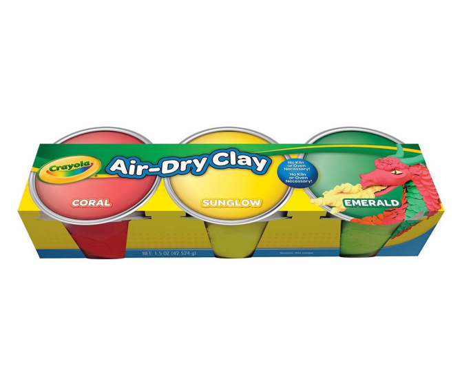 Crayola Air-Dry Clay is a fine, natural earth clay which dries to a hard solid: no kiln or oven necessary! The 3 colors, Coral, Sunglow and Emerald, come in reusable tubs to keep your Air-Dry Clay moist so it's ready when you need it. Safe and nontoxic.