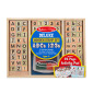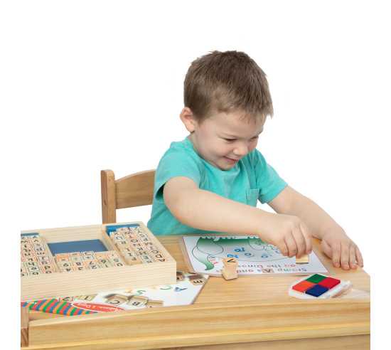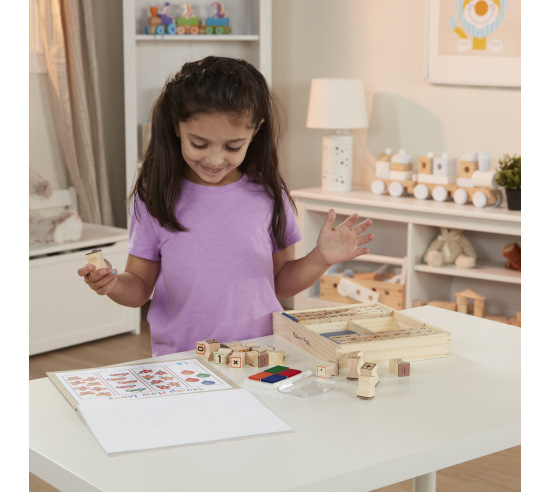 A wood alphabet stamp set including upper and lower case letters and punctuation to include 60 stamps and a four color stamp pad. Helpful for some children who may be too reserved to draw or paint or creating letters or stories. Packaged set measures 1.5" x 6.5" x 12"