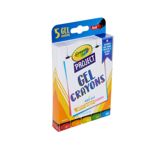 From the Crayola Project line, Gel Crayons offer rich, super smooth colors for art projects, homework assignments, and crafts. Just twist up to color, and twist down to protect the color core in the durable plastic casing. This set of 5 Gel Crayons is great for light and dark surfaces. Works on poster board, foam board, regular paper, and construction paper. Featured colors are: Red, Orange, Yellow, Green, and Blue.
