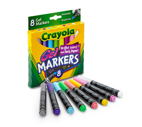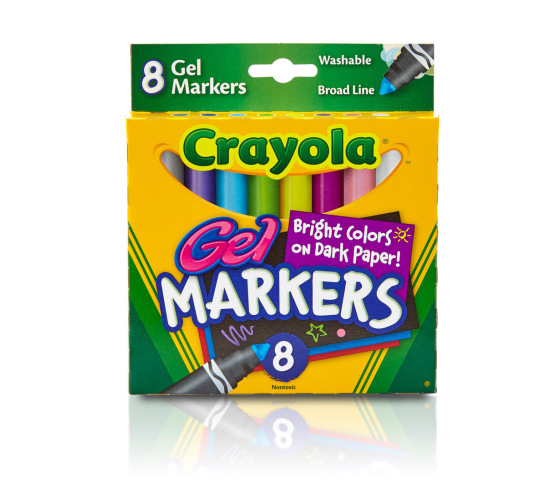 The Gel Washable Markers features 8 non-toxic washable markers specially formulated to wash from skin as well as most fabrics used in children's clothing. With Crayola Gel Markers, you can create cool effects on dark paper, poster board, plastic, foil, glass and more.