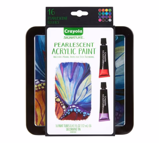 Crayola Signature Pearlescent Acrylic Paints offer vibrant colors that give off a shimmery gloss finish. These paints contain a multidimensional pigment that provides superior coverage. Set includes mixing wells for easy color blending. This stylish set comes with 16 Acrylic Paints and 3 Re-usable Paint Mixing Trays in a Decorative Storage Tin.