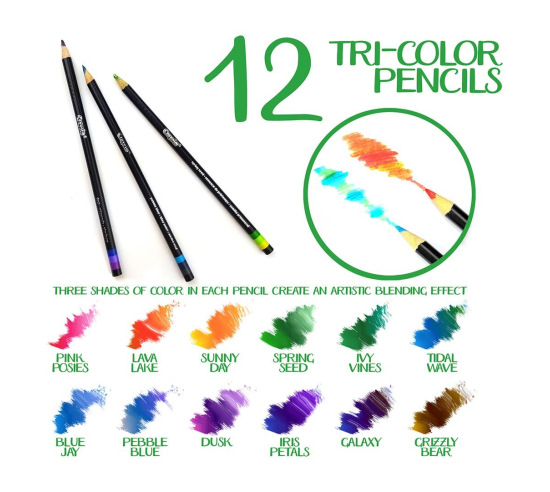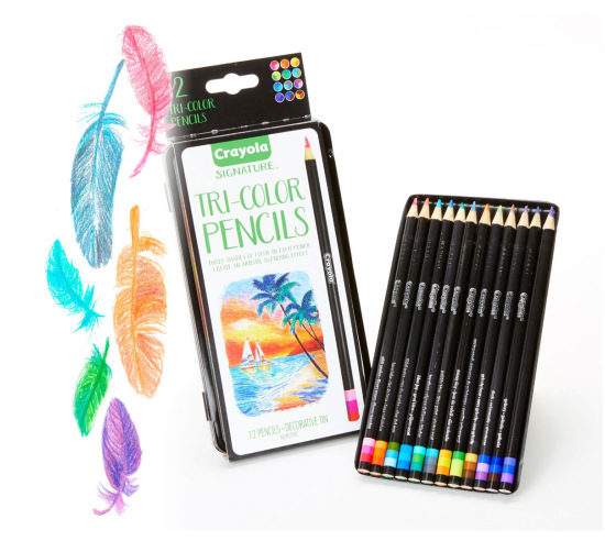 Crayola Signature Tri- Color Pencils are the perfect tools for your creative coloring projects. The velvety-soft gel cores provide a color-rich, smooth laydown—excellent for blending, shading, and special effects. Includes 12 colored pencils with 3 complementary colors in each pencil and a decorative storage tin.