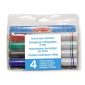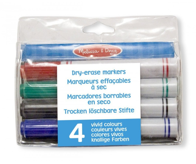 Set of dry erase markers in four vivid colors: red, green, blue, and black. Not washable but perfect for dry erase boards and wipes off easily.