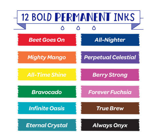 They’re markers with staying power! Make a statement and make it last with Take Note Permanent Markers—12 vibrant colors that you can use on just about anywhere. Say it like you mean it on coated paper, photos, clothes, or canvas sneakers—this Colored Marker Set even works on metal, plastic, wood, or glass! The Fine Tip Permanent Markers draw smooth fine lines on any of these surfaces, bringing intricate details and imaginative designs to life.