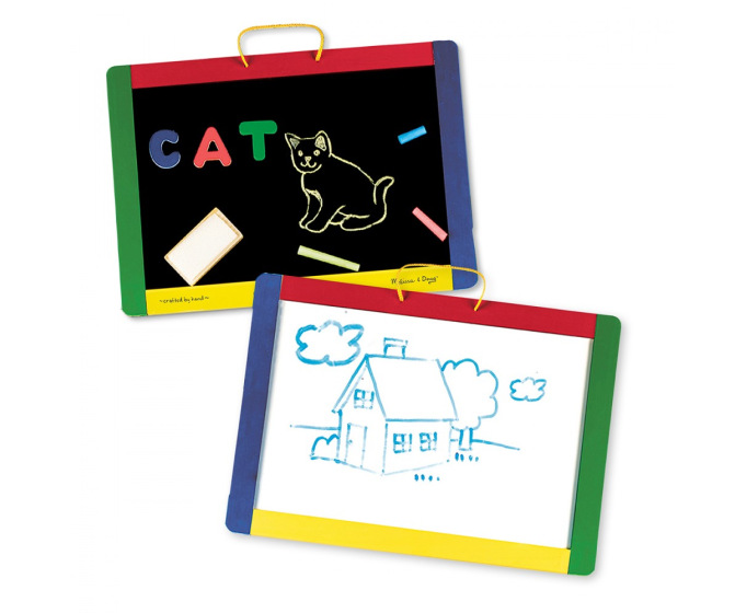 Children will love this economical whiteboard and chalkboard whether in your playroom or on the go. Board measures 12" x 16" x 0.75" and comes with three sticks of chalk, one dry erase marker, and 36 letters and numbers. Recommended age 3+