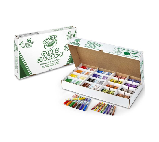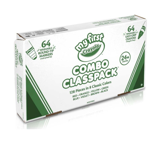 Packed with a total of 128 pieces in eight classic colors, the My First Crayola Crayons and Markers Combo Classpack encourages kids to get creative. This pack of 64 washable conical-tip markers and 64 easy-grip no-roll crayons is ideal for busy classrooms. A convenient cardboard box with corrugated cardboard dividers allow you to arrange the markers and crayons by color so everything stays organized and in one place.