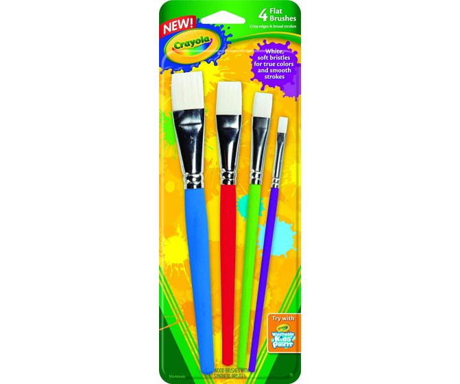 Paint broad strokes on posters and signs and fine lines on art and crafts. This set of flat paintbrushes is ideal for a variety of kids' school projects, signage, paintings, and more. The brushes feature brushed silver ferrules and measure from 1 inch wide to 1/4 inch wide. With four brushes in different sizes, kids can paint an array of lines and strokes.