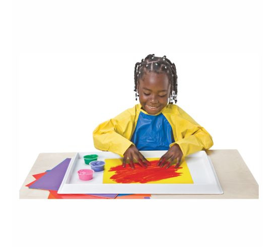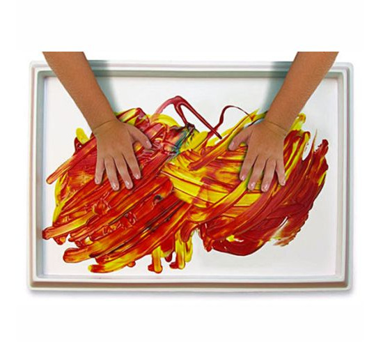 Love fingerpainting but hate the mess? The Fingerpainting No Mess tray is your solution. Tray holds paper of all sizes, with a ridged edge to keep the mess contained. Simply rinse it off when you're done. Works with fingerpaints, brushes, clay, glitter glue, and more. 12 x 18”