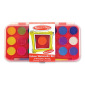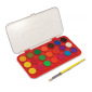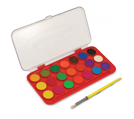 Set includes 21 washable watercolors in a deluxe carrying case and a paintbrush. Lid doubles as a mixing tray.