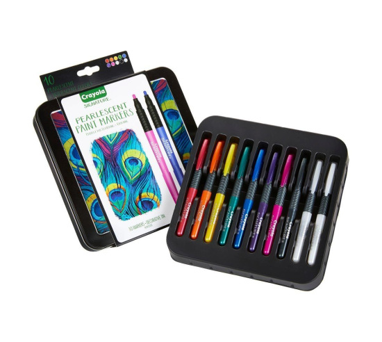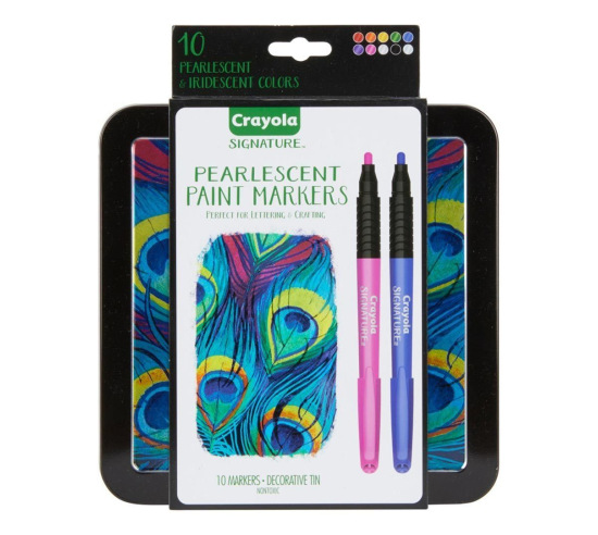 The entire collection helps art projects pop, especially on darker backgrounds! Plus, the Markers in Pearlescent Paint Colors are neatly kept in a Decorative Storage Tin, making this beautiful set a ready-to-give gift.