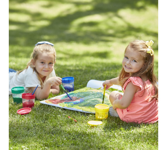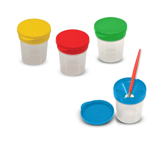 Pour paint in and keep it fresh for the next art session, lids snap on tightly for an air-tight seal. Set of four dishwasher-safe cups feature brush holders and snap-on storage lids.