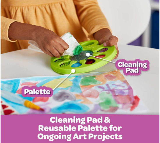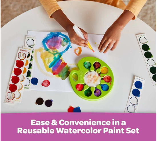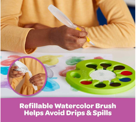 The Crayola Pop & Paint Watercolor Palette makes painting less messy and clean up a breeze! Each of the included 8 colors are printed on 96 disposable Watercolor Chips. Just pop out the chips, place them in the palette and use the Refillable Water Brush to activate the paint on each chip and you’re ready to create! Simply discard used chips and pop in new ones as needed. No spilling paint or cups of water and colors are washable from skin and fabric.