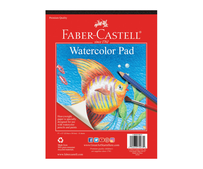 Made from 50% post-consumer recycled materials, this heavy duty paper pad is perfect for watercolor mediums of all kinds including watercolor crayons, watercolor pencils, gel sticks, and watercolor paints. 9"x12", 15 sheets per pad.
