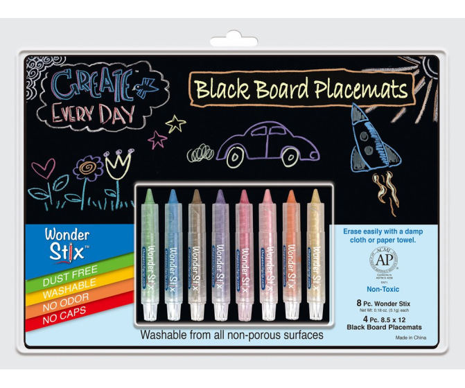 Draw and color with the included dust free Wonder Stix, and when you're done, wipe it with a damp cloth and you're ready to go again. Includes four blackboard playmats and 12 colorful Wonder Stix.