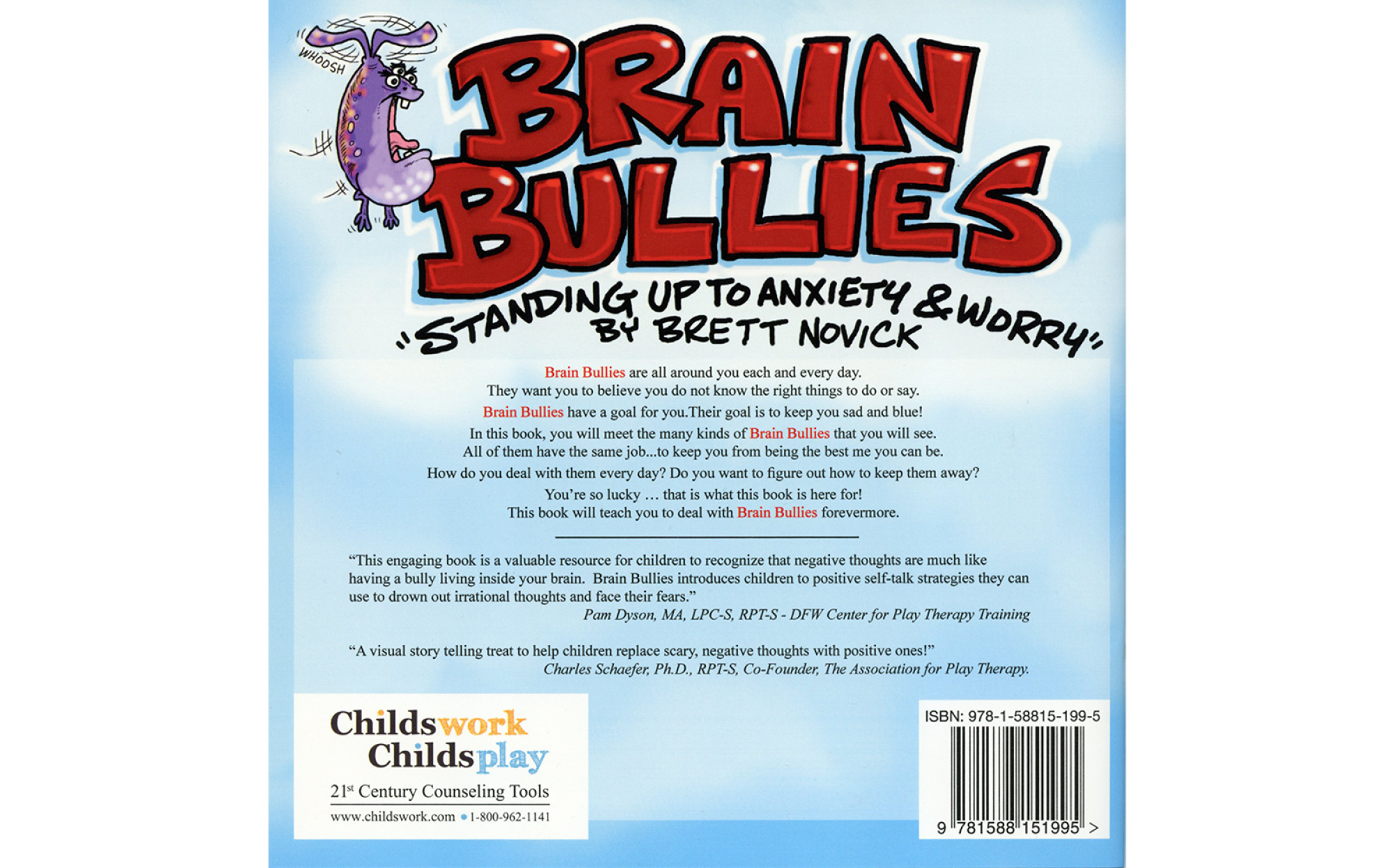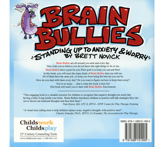 Brain Bullies is an effective tool for introducing the principals of cognitive therapy to children. The creative and colorful illustrations in Brain Bullies helps children identify the cognitive distortions that can make them anxious. The fun and nonthreatening illustrations of the “Brain Bullies” helps children develop an understanding of the internal dialogue that contributes to anxiety and other forms of emotional distress and upset. The most common distortive thought patterns are covered in Brain Bullies. Brain Bullies teaches children (with support from a counselor or parent) to identify and challenge cognitions that contribute to emotional distress and how to form alternative and adaptive cognitions. As children gain control over their “Brain Bullies” self-esteem is bolstered and anxiety is decreased. Counselors, parents, and teachers can play an active part in sharing and reading the text as they help children develop an appreciation and understanding of the different types of cognitive distortions, and which ones might apply to them.