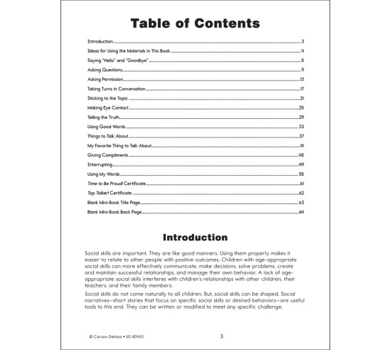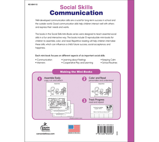 The Social Skills Mini-Books for Communication offers targeted social narratives that provide students with special needs in grades PK-2 the communication tools and strategies they need. This 64-page resource features reproducible mini-books that students can independently assemble, color, read, and personalize. This book addresses essential topics that include: Taking Turns in Conversation, Sticking to the Topic, Using My Words, and more.