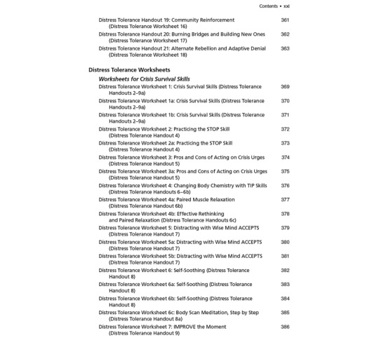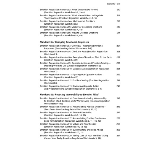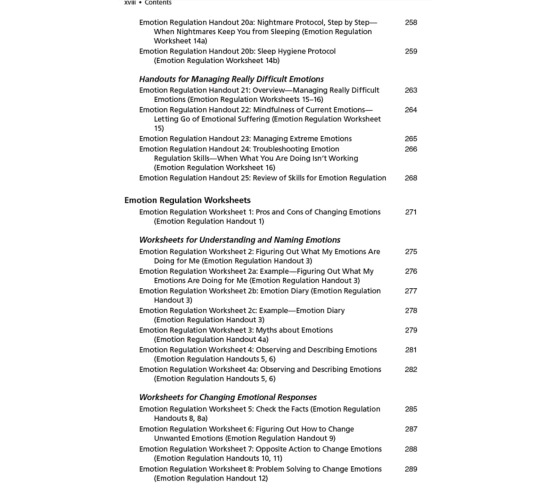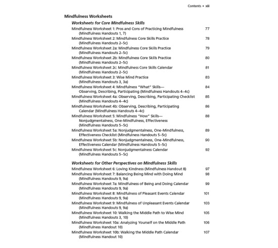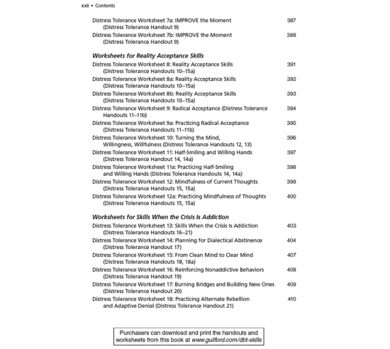 Featuring more than 225 user-friendly handouts and worksheets, this is an essential resource for clients learning dialectical behavior therapy (DBT) skills, and those who treat them. All of the handouts and worksheets discussed in Marsha M. Linehan's DBT Skills Training Manual, Second Edition, are provided, together with brief introductions to each module written expressly for clients. Originally developed to treat borderline personality disorder, DBT has been demonstrated effective in treatment of a wide range of psychological and emotional problems. No single skills training program will include all of the handouts and worksheets in this book; clients get quick, easy access to the tools recommended to meet their particular needs. The 8 1/2" x 11" format and spiral binding facilitate photocopying. Purchasers also get access to a Web page where they can download and print additional copies of the handouts and worksheets.