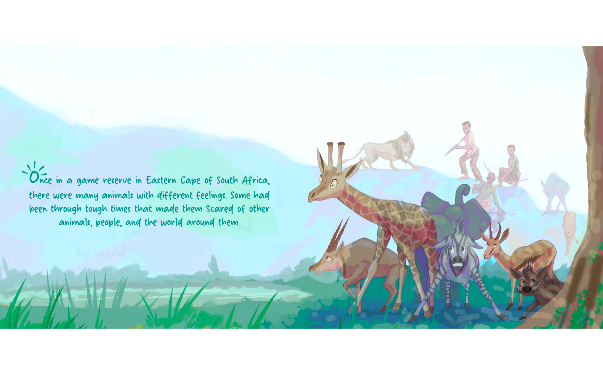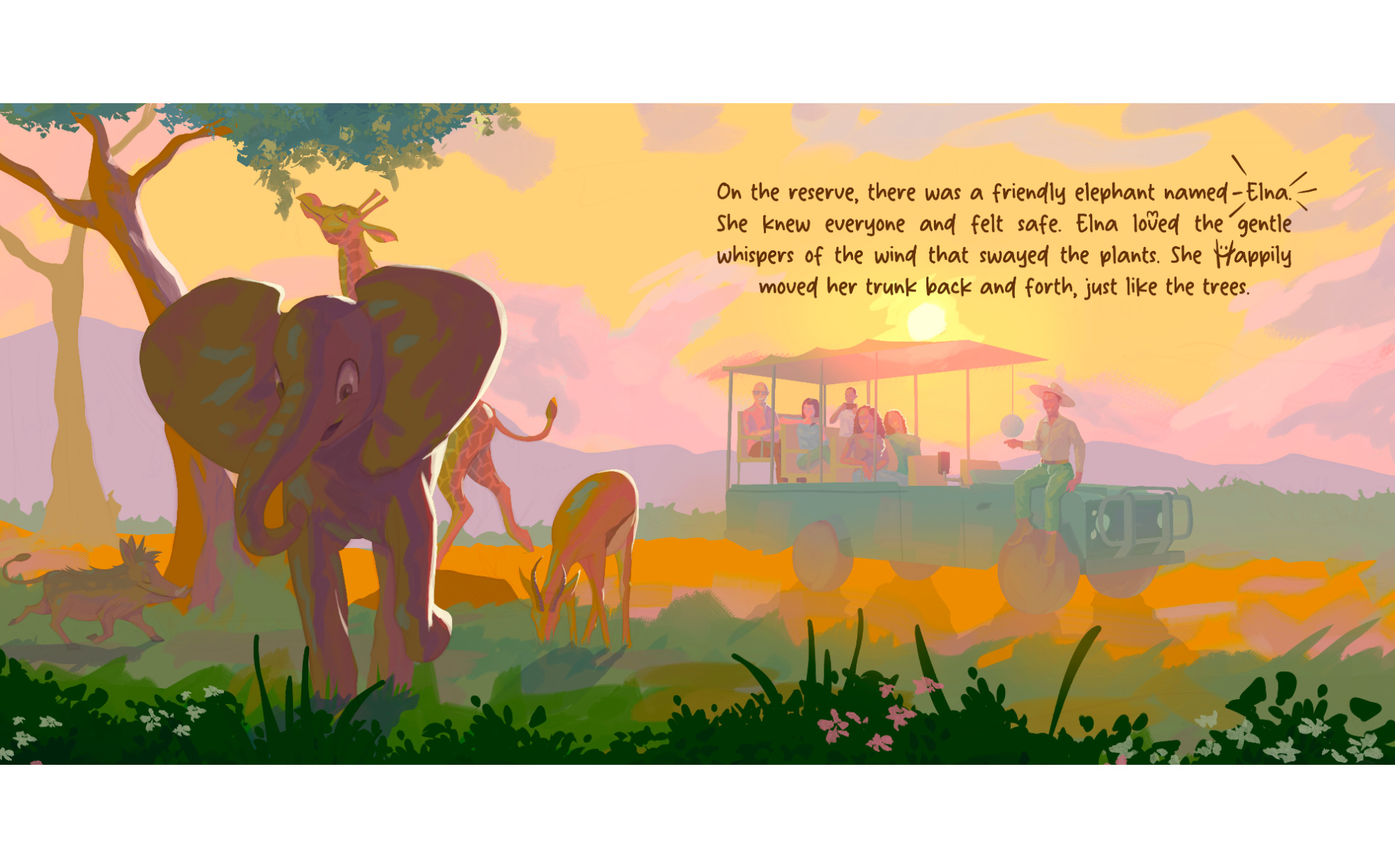 As Elna visits the watering hole, she meets a diverse group of animal friends-some playful, some cautious, and others still learning to trust. Through patience, shared stories, and gentle encouragement, the animals explore how to feel safe in uncertain times.