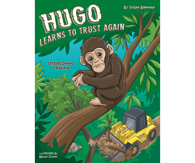 Hugo is a young playful Chimpanzee who loves living and playing with other chimps in the forest. All is wonderful until one day some traumatic events happen that would change his life. At first, he fears that his home is being destroyed by mysterious looking creatures. Then, his momma is tragically killed and he is captured. Hugo is terrified and not sure what will happen to him next. He is finally rescued. But Hugo is still noticeably affected by what he has experienced. Then he meets a special person who lovingly helps him learn to begin trusting again.
