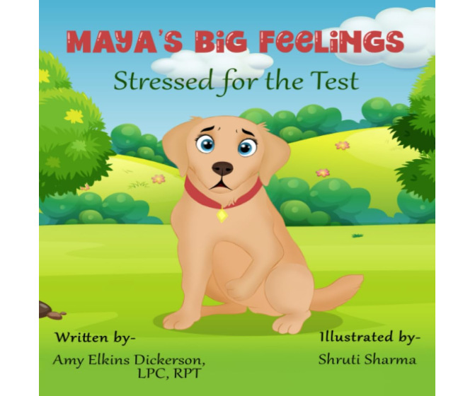 Maya is a yellow labrador retriever that is struggling with some big feelings. The morning before a big math test, Maya's Mama notices that Maya is feeling stressed. Maya's Mama then encourages Maya to talk back to the negative self-talk that is making Maya feel so stressed and teaches Maya how to use deep breathing to calm her body down before the test starts. After Maya learns these tools and feels seen and heard by her Mama, Maya feels more confident and knows how to manage her anxiety related to test taking. A note for grown-ups teaches adults how to help their child identify, express and cope with their emotions. The author also includes information on how to access her parenting podcast "Little Ones/Big Feelings with Amy Dickerson".