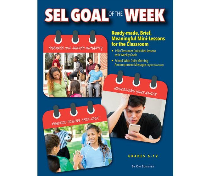 Written with the CASEL Framework in mind, SEL Goal of the Week provides a year’s worth of 3-5 minute scripted discussions, designed to interest and engage middle and high school students. It is a powerful stand-alone SEL curriculum delivered daily in individual classrooms that gains momentum with schoolwide implementation. But, that’s not all!! With built in flexibility, SEL Goal of the Week curriculum can also be utilized by school counselors (with small groups or individual students), club advisors and group leaders by mixing and matching topics based on needs and interests, and combining multiple mini-lessons to fill allotted class times.