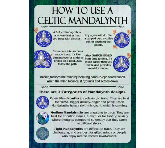 Pack of 10 full color cards in Celtic designs measure 5"x7" for portability. Trace with your finger, pen or pencil or stylus along the path to reduce stress and improve concentration. Includes suggestions for use.