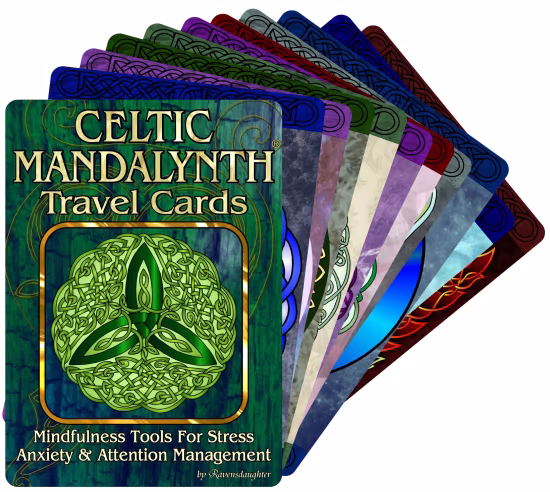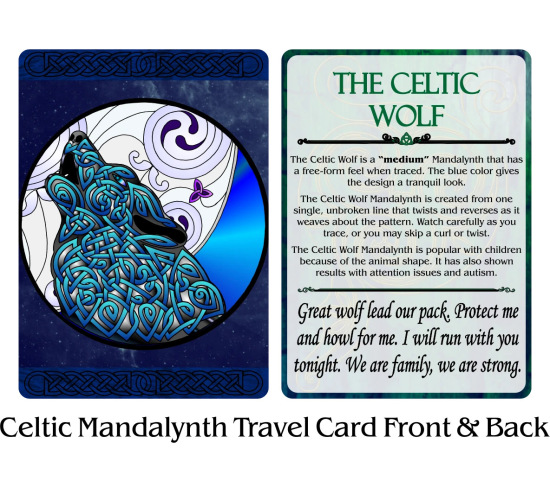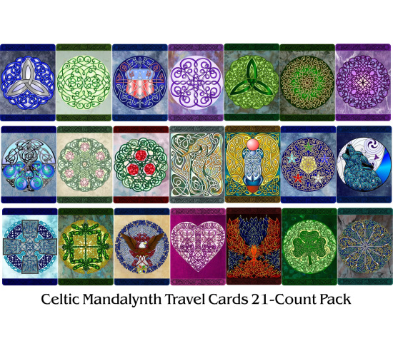 Celtic Mandalynth Travel Cards are perfect to take in a purse, bag or backpack. The cards are FLAT. Each measures 5” x 7” and comes with descriptive text and inspirational verse. Each pack comes in a clear cellophane bag, and has an instruction card and a glitter stick for tracing.