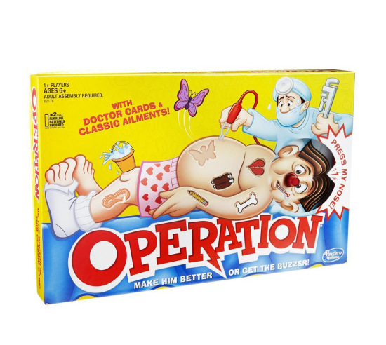 It's the classic Operation game from Hasbro. Cavity Sam is feeling a bit under the weather, and kids will love to "operate" and make him better. Use the tweezers to take out all of Cavity Sam's 12 funny ailment parts that parents might remember -- such as a wishbone, Charlie horse, and Adam's apple.