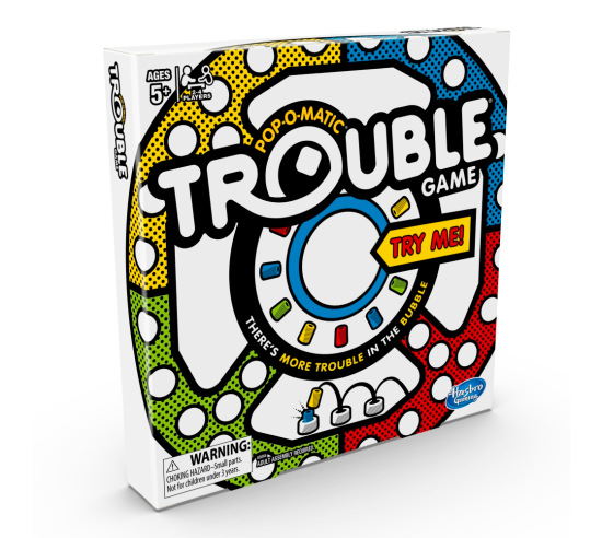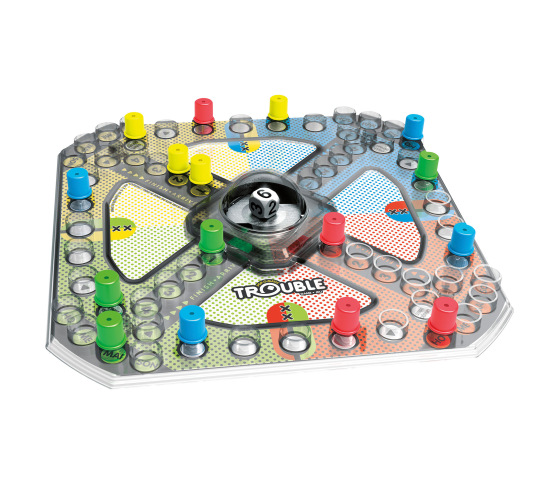 The Trouble game is peg-popping fun! The excitement begins as soon as a player presses the Pop-O-Matic bubble to roll the die. In the Trouble board game, kids race to get all their game pieces around the board, but be careful! A player could get bumped and sent back to the beginning. Kids can play the classic Trouble game or a more challenging version with Power Up spaces. Be the first player to get all 4 pegs into the Finish zone to win. The Trouble board game can be a fun activity for kids ages 5 and up -- 2, 3, or 4 players can play at a time.