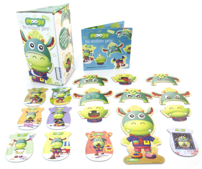 Emo Moogy is a game to help children identify emotions through the silly character Moogy. Recommended age 3-5 years. Includes 11 pieces and 8 emotions cards.
