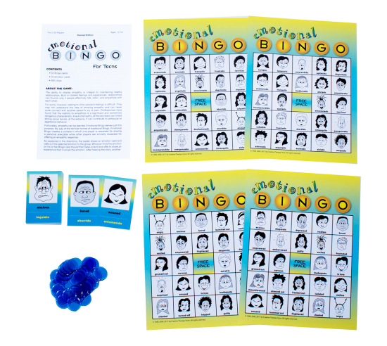 Emotional Bingo offers a new, yet familiar, approach to feelings that appeals to kids of all ages. The game includes 32 Emotional Bingo Cards (English on one side; Spanish on the other), Tokens, Call-Out Cards, and a helpful Leader's Guide, with discussion guidelines and counseling suggestions. Also available in a teen version.