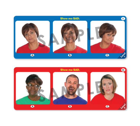 Level 1 Cards - Each card presents one person exhibiting three different emotions. Student listens to/reads the prompt (Show me SAD.) and points to the correct facial expression associated with that emotion.