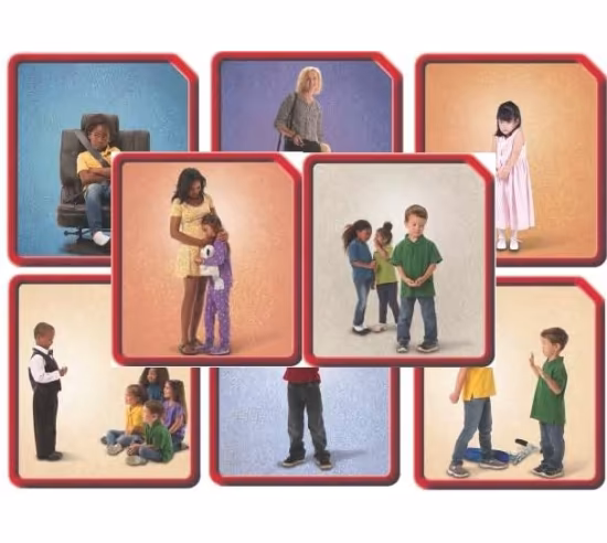 A set of 24 images printed on durable cardstock to encourage children to connect with their emotions. Foster empathy by asking students to describe the feelings pictured on each card. Also great for use as story starter prompts and many other activities. Large 8.5" x 9.25" cards.