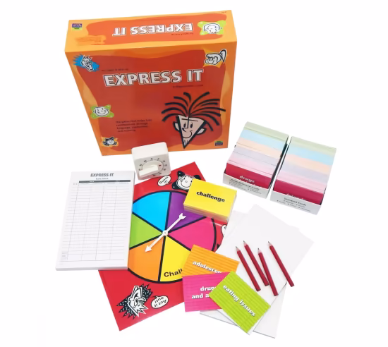 Ages 8 through teen. 4-12 players. Here is a fun, fast-moving game that encourages players to express themselves with language, pantomime, and drawing. The card format provides a safe, structured way to address the often awkward topics that kids need and want to discuss: feelings, family, friends, school, and childhood. For teen players, you can add card decks that focus on eating habits, depression and suicide, drugs and alcohol, sexuality, and adolescence.