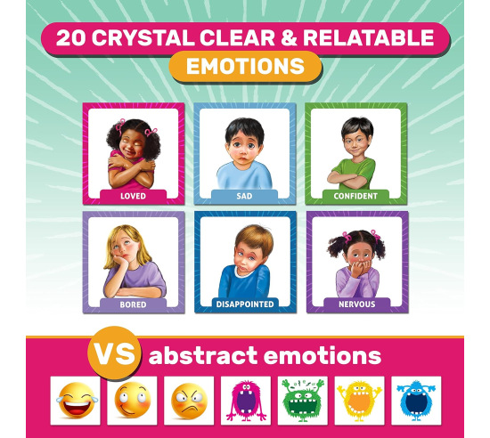 A fully laminated 7" x 7", 20 page emotion book for kids, with bright pictures and multi-cultural characters, numerous coping solutions for anger management and emotional intelligence, and an 18 page handbook with clear explanations. Perfect tool as an educational game for children in preschool and elementary classrooms. Use as a vocabulary builder, emotion cards for kids, self esteem builder, and as a social skills activity. Watch your students blossom in their emotional understanding.