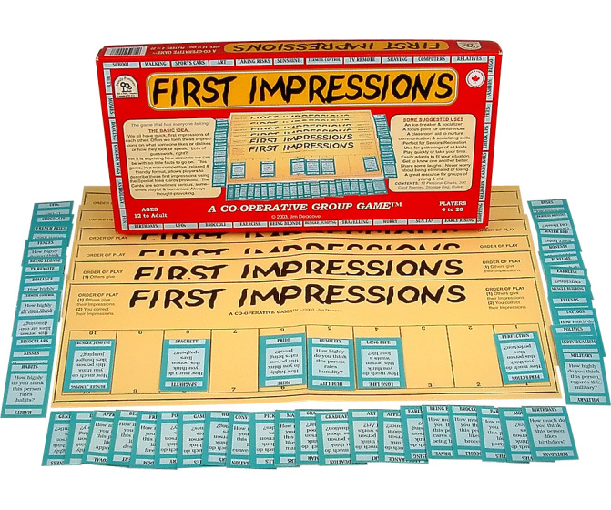 Often we form first impressions of each other based on what someone likes or dislikes, or how they look or speak. This game, in a non-competitive, relaxed and friendly format, allows players to describe these first impressions using the Special Idea Cards provided. The Cards are sometimes serious, sometimes playful and humorous. Always thought-provoking.