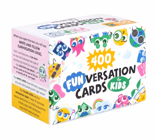 FUNversations for Kids is a deck of 400 prompts designed to spark creativity and connection for kids aged 6-11 and their families. Perfect for family game nights, road trips, and classrooms, these 2.5" x 1.75" cards fit in a 3.75" x 2.5" portable box, making it easy to bring anywhere.