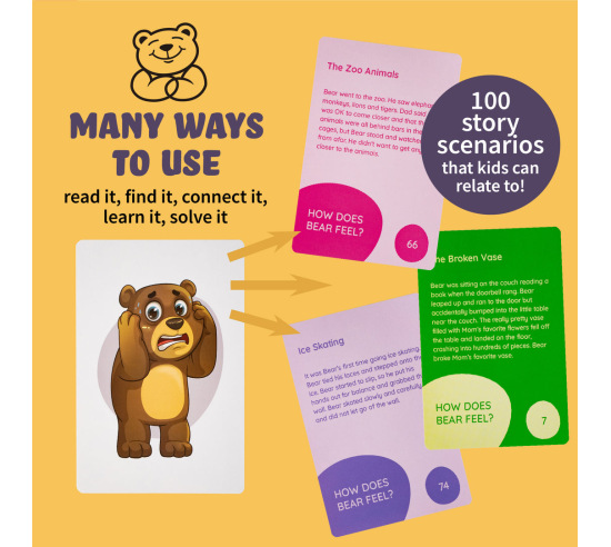 Introducing How Does Bear Feel, a fantastic therapy tool for kids that comes with 20 large bear emotion cards and 100 short story scenarios that are highly relatable to kids. These emotion cards are designed to help children improve their coping techniques and emotional understanding in a fun and interactive way.