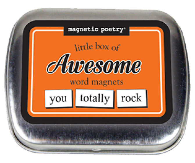 Cute as a button, this tiny little tin contains 72 word magnets with uplifting words such as: absolutely, coolest, brilliant, the best, incredible and more. Very portable, and useful for many creative activities.