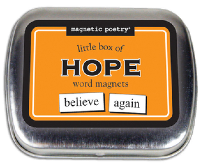 Cute as a button, this tiny little tin contains 72 word magnets with uplifting words such as: bright, possible, good, love, dream, and more. Very portable, and useful for many creative activities.