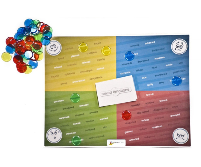 This best-selling activity includes a newly designed board, 60 chips, and 90 situation cards. The board and chips can be used for a variety of CBT activities in individual or group therapy and is frequently used in school counseling as well. Each card presents a person confronting a situation that might evoke "mixed emotions." The persons presented include children, teens, and adults. This mixture allows players to put themselves in the place of other people, which helps players understand multiple view-points and aids in the development of empathy.
