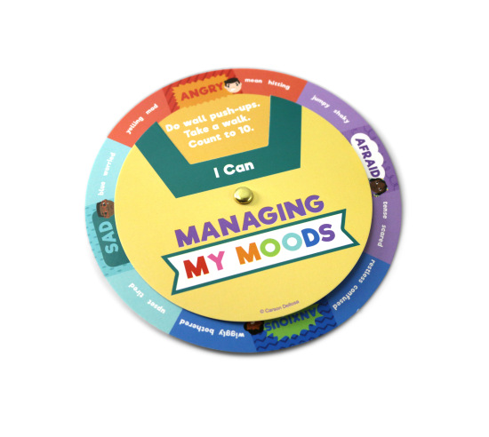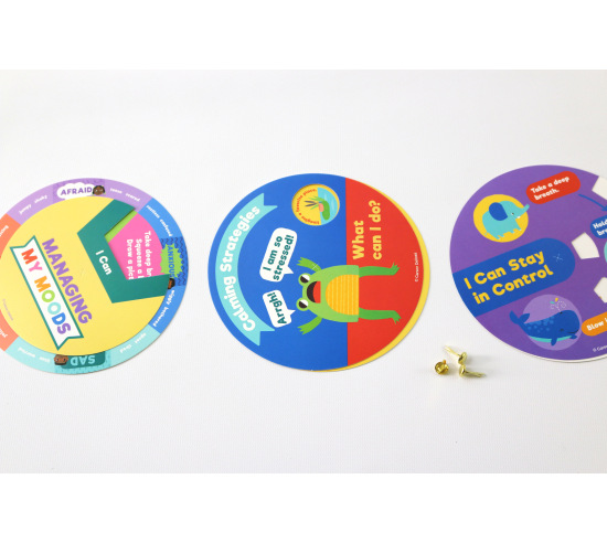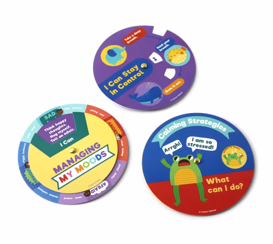 Set of three calming wheels. Each wheel can be rotated to reveal calming options. The three wheels included are Staying in Control, Calming Strategies, and Managing Moods.