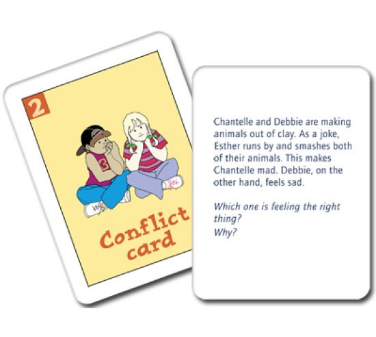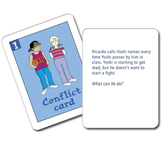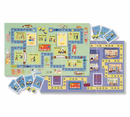 On both sides of the gameboard, players must use the skills learned to resolve thought-provoking conflict vignettes presented on game cards. These vignettes—and an engaging, double-sided gameboard populated with diverse children—make Peacetown not only effective, but also fun.