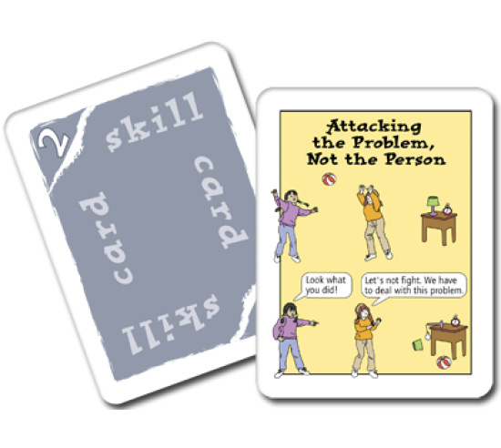 Using one side of the gameboard, which shows the exteriors of Peacetown, players learn basic conflict resolution skills: apologizing, compromising, taking turns, sharing, avoiding, ignoring, and getting help. Then, turning the board over, they move inside the buildings of Peacetown, where they learn deeper conflict resolutions skills: listening, respecting differences, communicating feelings, taking responsibility for actions, and attacking the problem rather than the person.