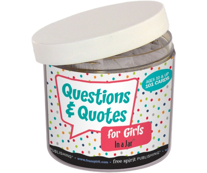 Questions and Quotes for Girls in a Jar features 101 cards with interesting, discussion-provoking questions, famous quotes, and ideas for girls ages 10 and up. Great activity for group or individual counseling. Comes in a handy screwtop jar.