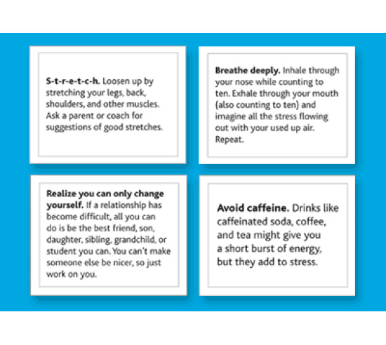Ideas, activities, and tips on stress management you can use to deal with the stress you are feeling about friends, school, or things happening at home.