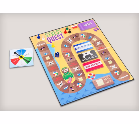 Stress Quest is designed to teach children coping skills for managing stress and anxiety. Board game is composed of six play spaces including relaxation, yoga, danger, top secret, quest and beach ball. Stress Quest will encourage self disclosure, teach coping skills, and engage them physically with a variety of yoga poses.